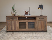 2 Drawer, 2 Door, 2 Glass Door TV Stand. Take your living room to the next level with the Natural Parota TV Stand, featuring a middle shelf, two glass doors and closed storage on both sides for your media essentials or décor, whether in your living room or bedroom. The sleek metal hardware and boxy wood frame create an overall timeless elegance, effortlessly enhancing the aesthetic of any room. Its striking presence is guaranteed to leave a lasting impression.