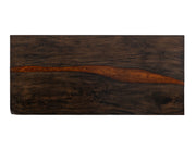 Raramuri, Table. The Raramuri dining table is a high-quality addition to any dining room, crafted from sustainable mango wood and featuring a unique finish. This table has a natural live-edge top, ensuring that each piece is one-of-a-kind. The tabletop is enhanced with epoxy resin infused with copper mineral flakes, which adds both durability and visual interest. The dining table set highlights the natural beauty and tonal variations of mango wood. The base is made from sturdy wood, providing a stable and long-lasting foundation, making it ideal for everyday use.