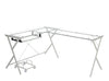 Corner Computer Desk Orientation: "L" ShapeX-Shape Metal Frame BaseRectangular Table Top w/Tempered GlassKey Board Tray IncludedComputer Holder Included